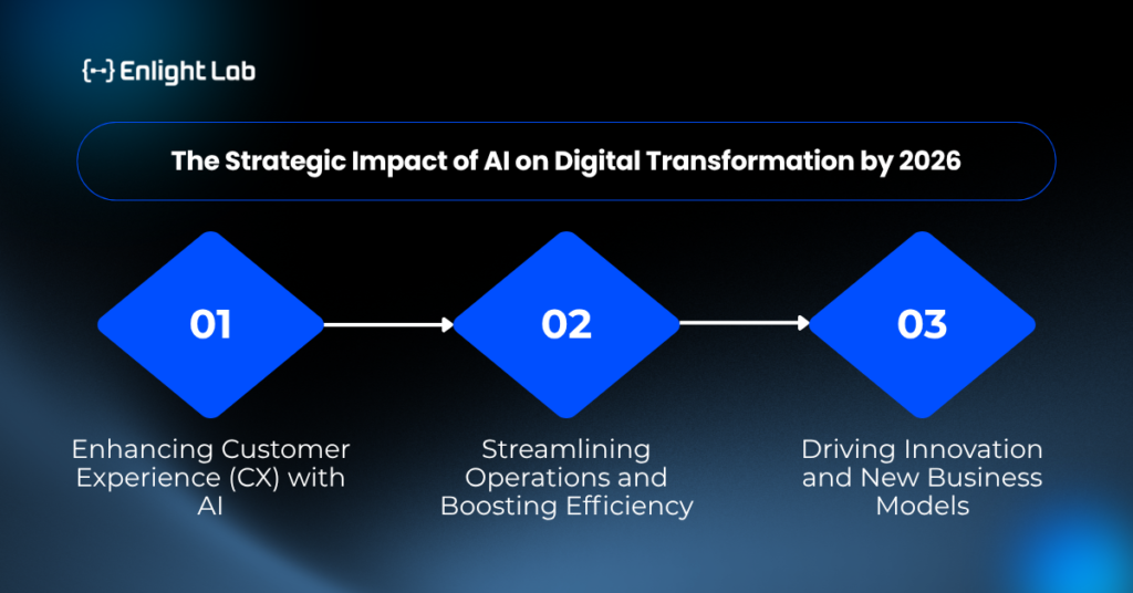 AI plays a central role in digital transformation by enabling organizations to automate processes, make data‑driven decisions, personalize customer experiences, and build adaptive, intelligent systems. In 2026, AI has evolved from a support tool to a core business capability driving innovation, scalability, and competitive advantage.